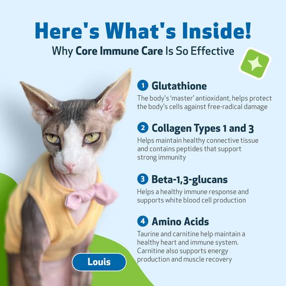 Core Immune Care provides a targeted, holistic blend of antioxidants to help maintain cellular health and normal immune function. Collagen types 1 & 3 also provide skin, joints, and connective tissue support, contributing to your pet's overall well-being. Whether for daily wellness or additional immune support, Core Immune Care helps your furry friend stay active and resilient at any life stage.