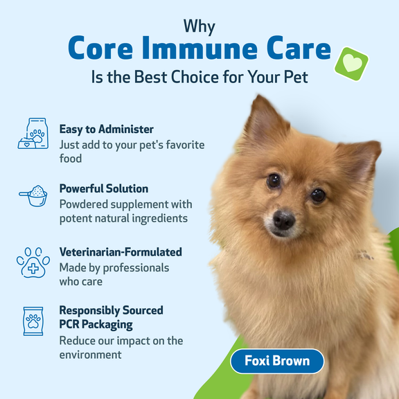 Introducing CORE IMMUNE CARE, your pet's daily immune-supporting superhero. Formulated by a leading veterinarian with expertise in pet nutrition, this antioxidant powerhouse is perfect for pets of all ages, especially our cherished seniors. Simply give during or after mealtime for seamless integration into their daily routine and any regimen.